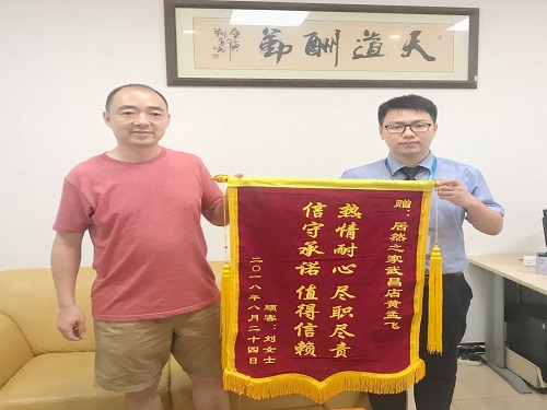 近(jin)期,武昌店業務(wu)部黃孟飛在客訴(su)處理的(de)(de)過程中,熱(re)情(qing)耐心,盡職盡責(ze),圓滿(man)的(de)(de)解決了(le)顧客劉女(nv)(nv)士(shi)的(de)(de)訴(su)求。劉女(nv)(nv)士(shi)的(de)(de)老公特(te)贈送了(le)一(yi)面錦(jin)旗,用以表示(shi)對黃孟飛的(de)(de)感謝和對居然之家(jia)售后服務(wu)的(de)(de)認可(ke)。