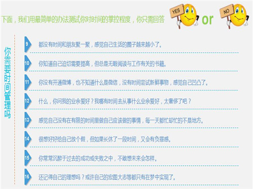 培(pei)(pei)訓(xun)從(cong)一場有(you)趣(qu)的(de)時間(jian)(jian)管(guan)理測(ce)試(shi)展開,通過有(you)趣(qu)的(de)問答讓(rang)大家(jia)快速進入情(qing)境(jing),加(jia)深對培(pei)(pei)訓(xun)必要性(xing)的(de)認知。時間(jian)(jian)和才華是我們(men)一生(sheng)(sheng)(sheng)擁有(you)的(de)兩(liang)大財(cai)富(fu),但(dan)若是隨著時間(jian)(jian)的(de)流逝(shi),我們(men)的(de)才華并沒有(you)增加(jia),這就是虛度(du)了時光。只有(you)我們(men)妥善安排并利用好(hao)時間(jian)(jian),通過實現(xian)人生(sheng)(sheng)(sheng)旅途(tu)中一個個小目標(biao),才能最終實現(xian)自己(ji)的(de)人生(sheng)(sheng)(sheng)大目標(biao),實現(xian)規(gui)劃中的(de)理想生(sheng)(sheng)(sheng)活。